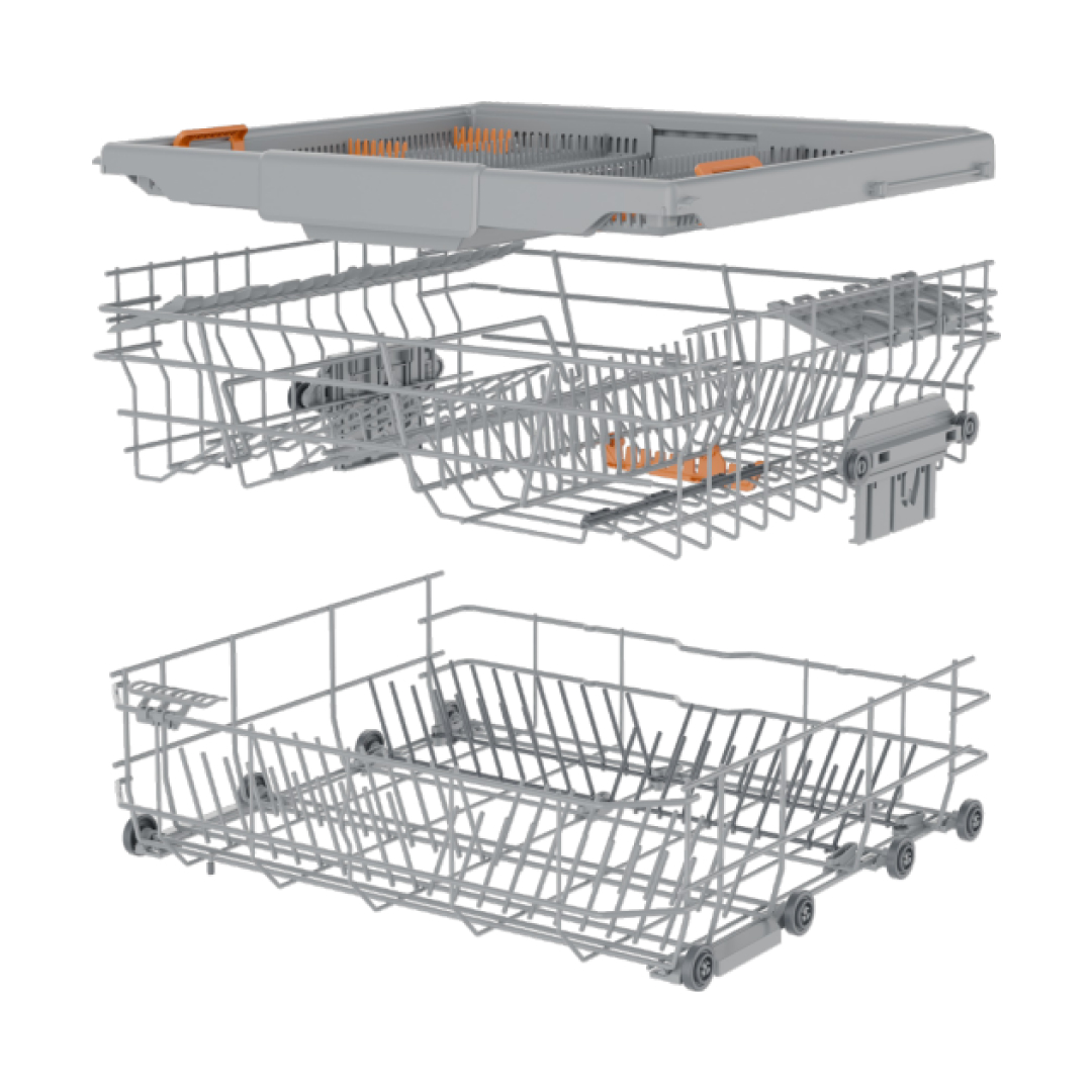 Sistem od tri korpe daje vam neverovatnu prilagodljivost za sve vaše potrebe. Srednja korpa je opremljena kugličnim ležajevima za najtiše i najglatkije kretanje koje ćete ikada iskusiti. Podesiva visina srednje korpe za 4cm sa podesivom korpom za pribor za jelo omogućava ubacivanje i pranje posuđa raznih veličina i oblika. Gornja korpa za pribor za jelo je napravljena sa fleksibilnošću upotrebe – možete staviti veće delove pribora za jelo, ili čak šolju za espreso, ili samo pomeriti jedan deo korpe u stranu i iskoristiti ovaj novi prostor za veće staklo u srednjoj korpi. Ovaj sistem sa tri korpe vam omogućava da perete do 16 setova posuđa istovremeno.